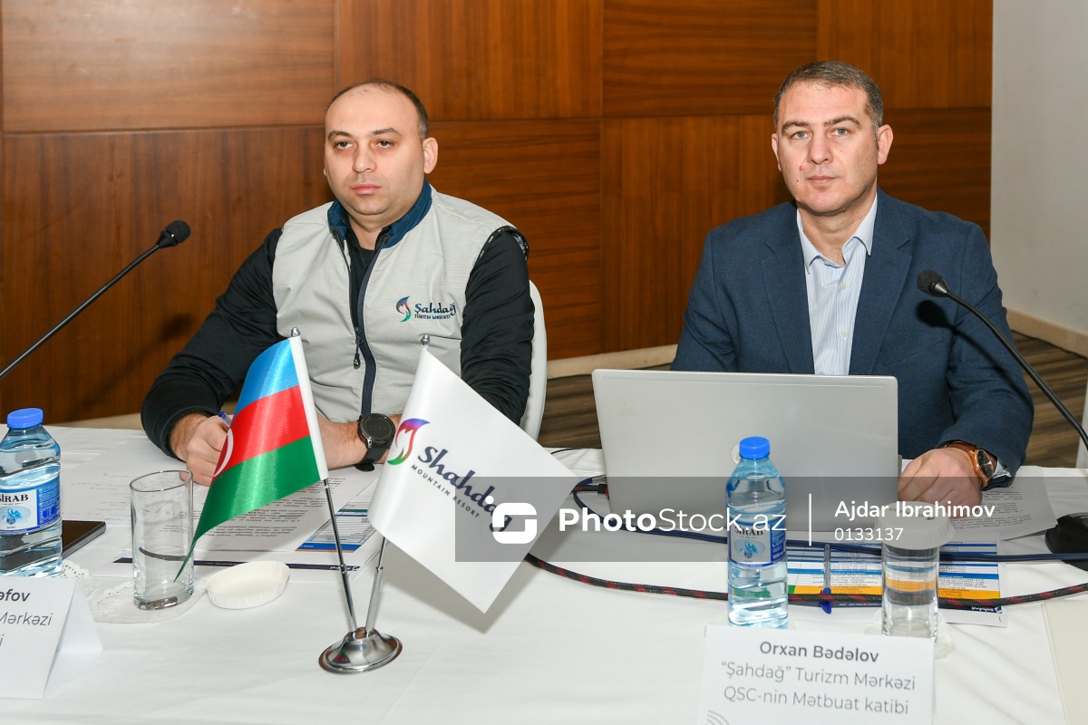 “Şahdağ” Turizm Mərkəzinə təşkil olunmuş mediatur çərçivəsində mətbuat konfransında iştirak edən "Şahdağ Turizm Mərkəzi" QSC-nin sədri Rüstəm Nəcəfov (sol) və mətbuat katibi Orxan Bədəlov (sağ).
