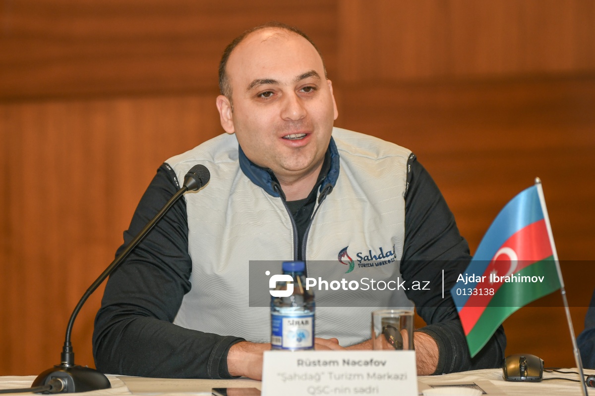 “Şahdağ” Turizm Mərkəzinə təşkil olunmuş mediatur çərçivəsində mətbuat konfransında iştirak edən "Şahdağ Turizm Mərkəzi" QSC-nin sədri Rüstəm Nəcəfov.