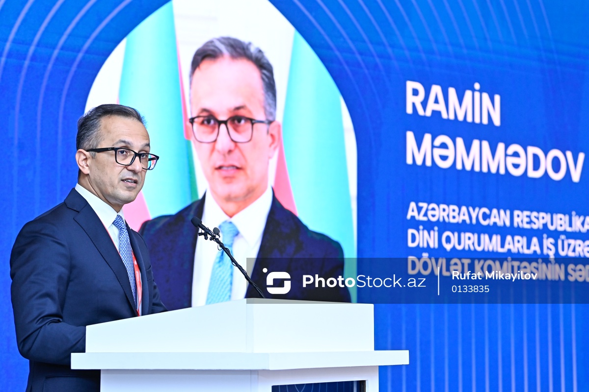 Din Xadimlərinin II Forumunda çıxış edən Azərbaycan Respublikasının Dini Qurumlarla İş üzrə Dövlət Komitəsinin sədri Ramin Məmmədov.