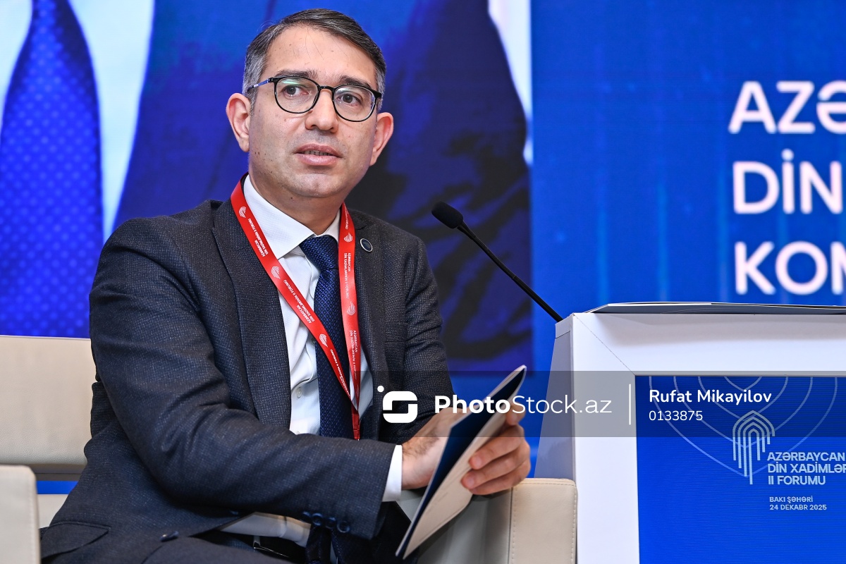 Din Xadimlərinin II Forumu çərçivəsində təşkil edilən "Multikultural dəyərlər sistemi: dövlət-din münasibətlərinin hüquqi və mədəni aspektləri" mövzusunda paneldə çıxış edən Azərbaycan Respublikasının Dini Qurumlarla İş üzrə Dövlət Komitəsinin sədr müavini Gündüz İsmayılov.