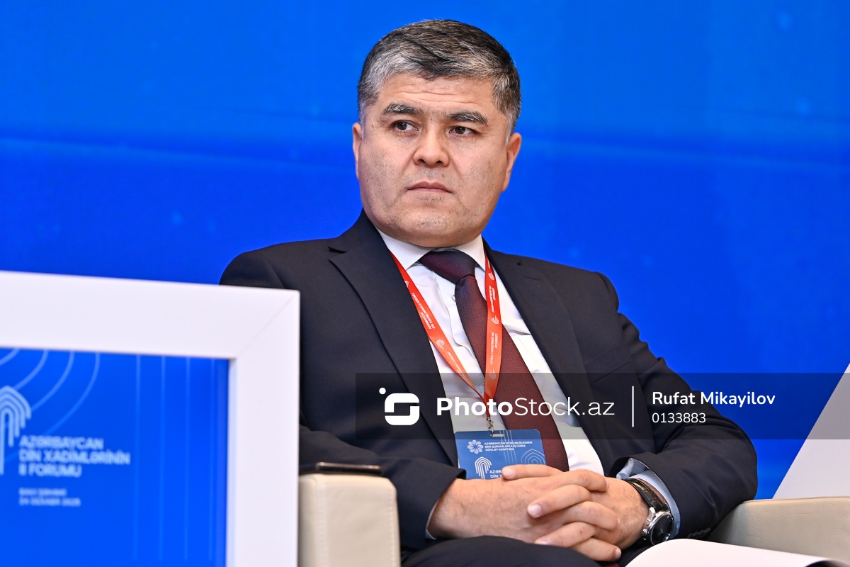 Din Xadimlərinin II Forumu çərçivəsində təşkil edilən "Multikultural dəyərlər sistemi: dövlət-din münasibətlərinin hüquqi və mədəni aspektləri" mövzusunda paneldə çıxış edən Özbəkistan Din İşləri Komitəsi sədrinin birinci müavini Davronbek Maxsudov.