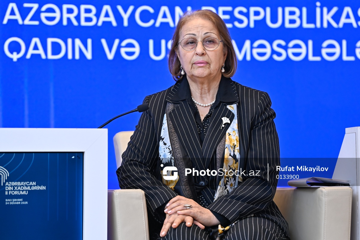 Din Xadimlərinin II Forumu çərçivəsində "Qadınların sosial və mənəvi inkişafında dini icmaların rolu" mövzusunda paneldə çıxış edən Ailə, Qadın və Uşaq Problemləri üzrə Dövlət Komitəsinin sədr müavini Sədaqət Qəhrəmanova.