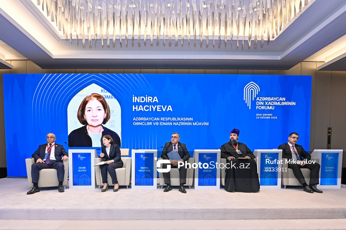 Din Xadimlərinin II Forumu çərçivəsində təşkil edilən "Qlobal təsirlər fonunda gənclərin maarifləndirilməsi: Müasir metod və innovativ yanaşmalar" mövzusunda paneldə iştirak edən (soldan-sağa) Milli Məclisin İctimai birliklər və dini qurumlar komitəsinin sədr müavini, millət vəkili Sahib Alıyev, gənclər və idman nazirinin müavini İndira Hacıyeva, Mediasiya Şurası İdarə Heyətinin sədri Nadir Adilov, Rus Pravoslav Kilsəsinin Bakı və Azərbaycan Yeparxiyasının yepiskopu Aleksiy Smirnov, Mənəvi Dəyərlərin Təbliği Fondunun icraçı direktorunun müavini Ceyhun Əliyev.