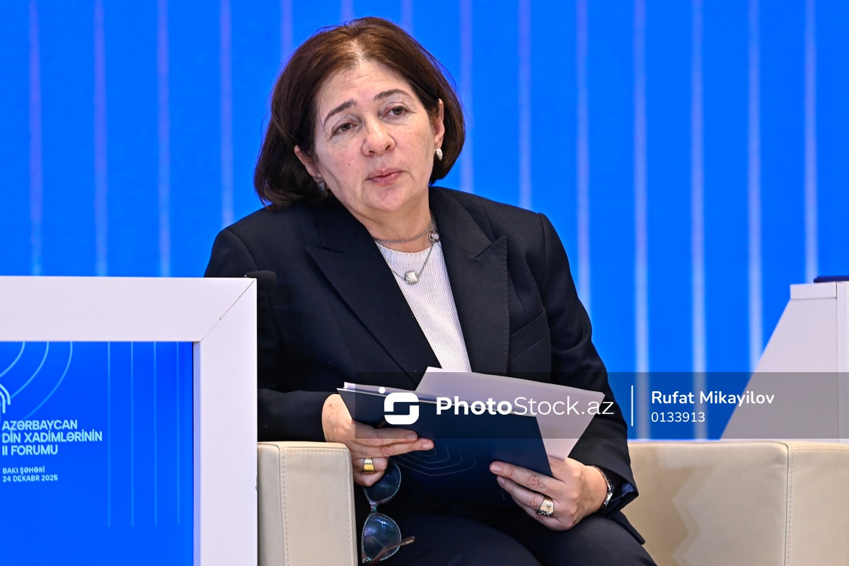 Din Xadimlərinin II Forumu çərçivəsində təşkil edilən "Qlobal təsirlər fonunda gənclərin maarifləndirilməsi: Müasir metod və innovativ yanaşmalar" mövzusunda paneldə çıxış edən Azərbaycan Respublikasının gənclər və idman nazirinin müavini İndira Hacıyeva.