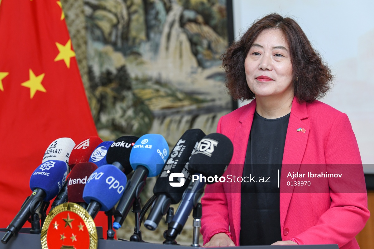 Bakıda keçirdiyi mətbuat konfransında çıxış edən Çin Xalq Respublikasının Azərbaycandakı fövqəladə və səlahiyyətli səfiri Lu Mey.