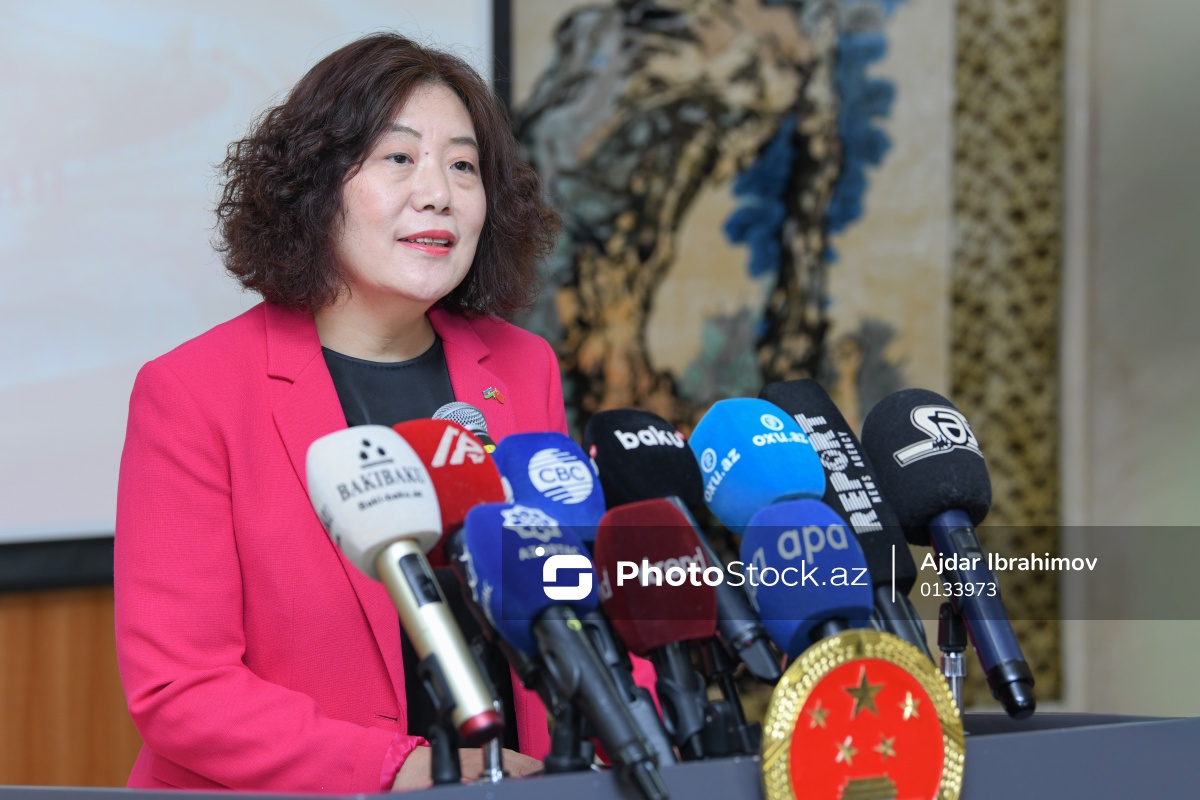 Bakıda keçirdiyi mətbuat konfransında çıxış edən Çin Xalq Respublikasının Azərbaycandakı fövqəladə və səlahiyyətli səfiri Lu Mey.