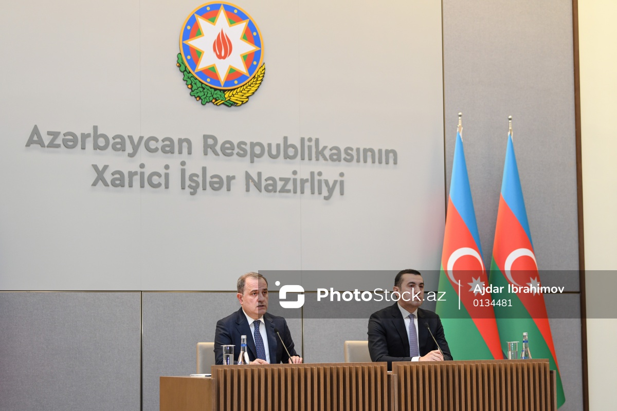 Azərbaycan Respublikasının Xarici İşlər Nazirliyində keçirilən mətbuat konfransında iştirak edən xarici işlər naziri Ceyhun Bayramov (sol) və Xarici İşlər Nazirliyinin mətbuat katibi Ayxan Hacızadə (sağ).