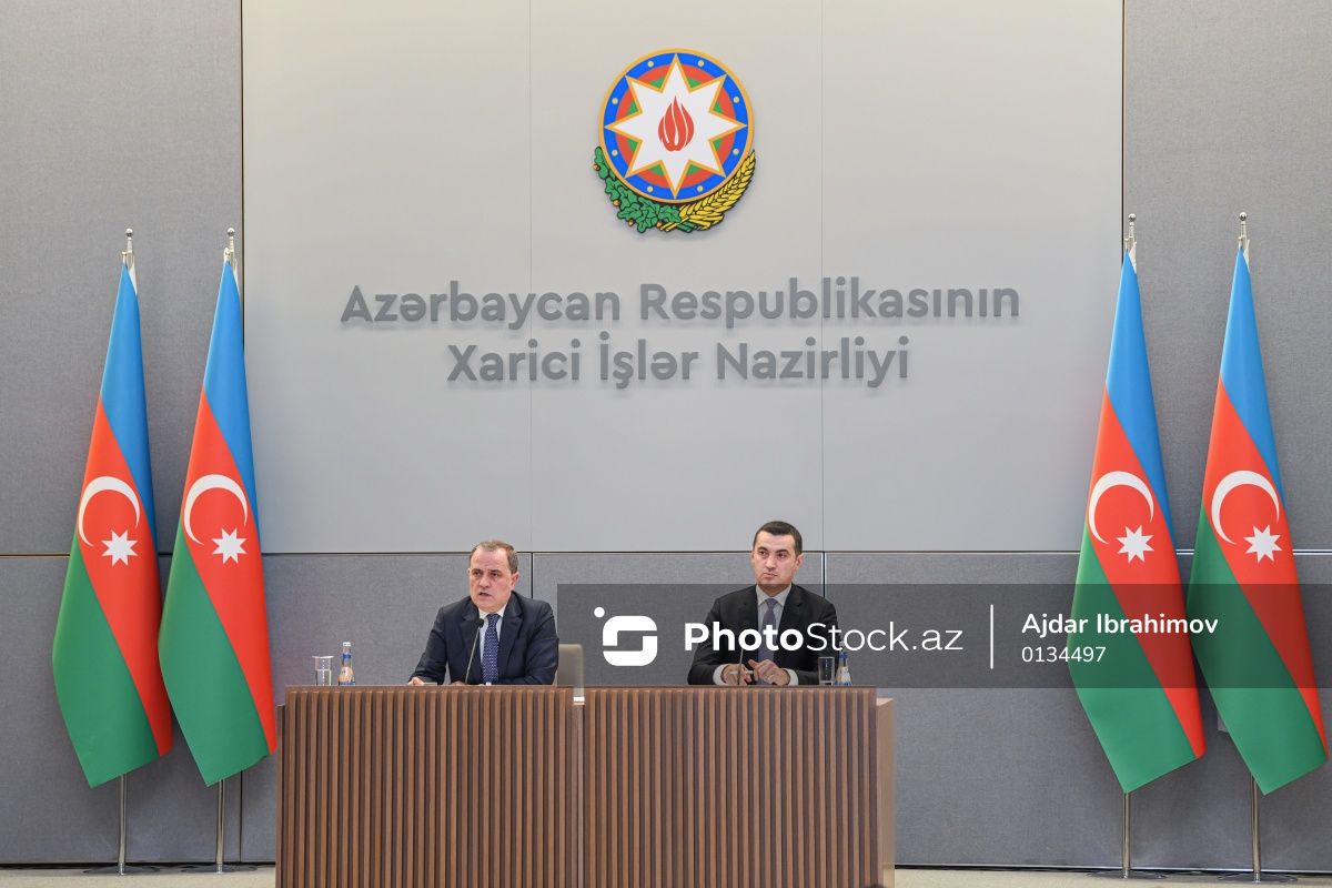 Azərbaycan Respublikasının Xarici İşlər Nazirliyində keçirilən mətbuat konfransında iştirak edən xarici işlər naziri Ceyhun Bayramov (sol) və Xarici İşlər Nazirliyinin mətbuat katibi Ayxan Hacızadə (sağ).