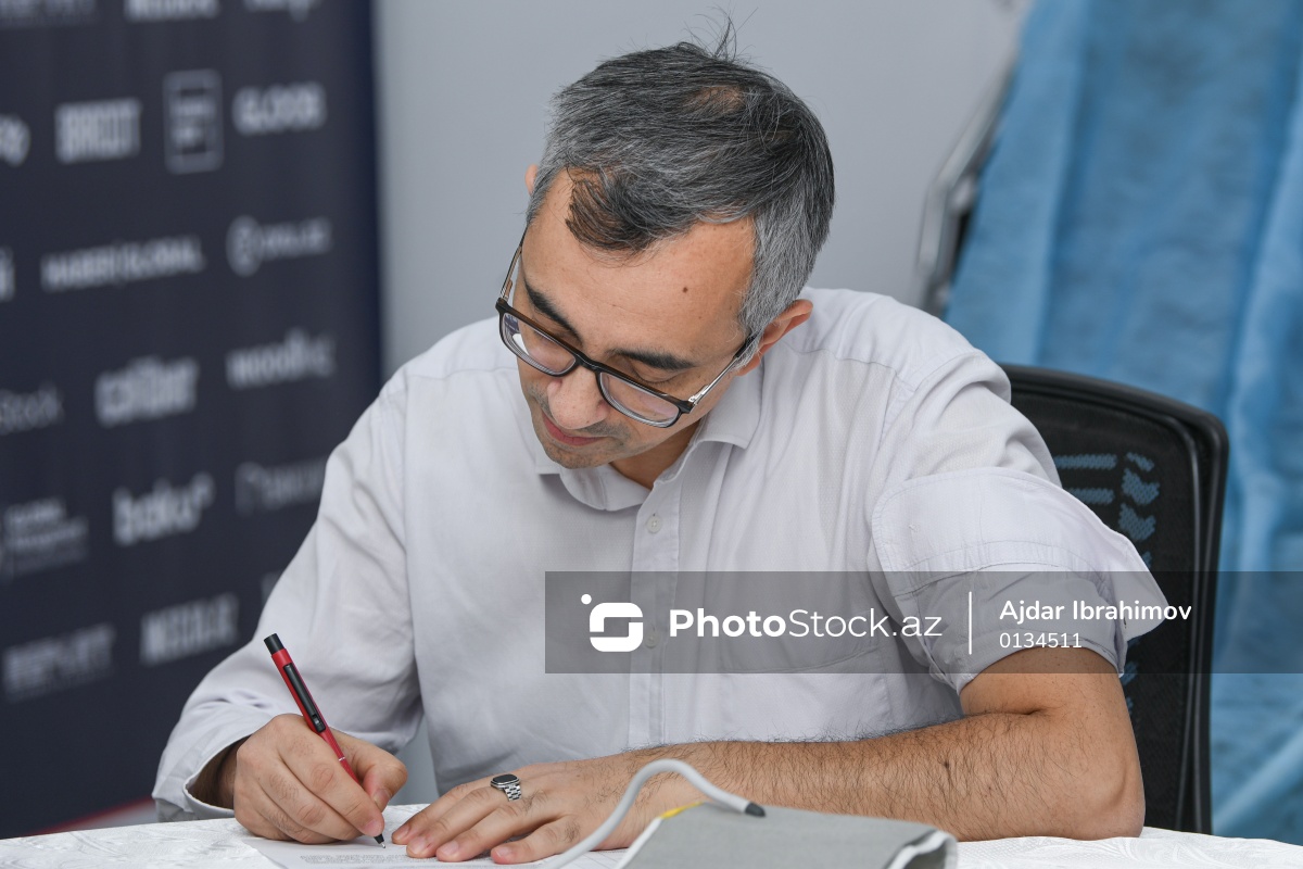 "Global Media Group"da keçirilən qanvermə aksiyasında iştirak edən “Report” İnformasiya Agentliyinin direktoru Fuad Hüseynəliyev.