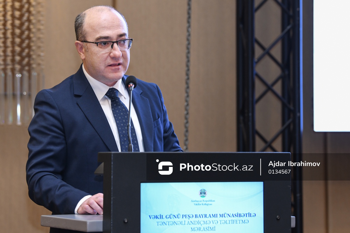 "Vəkil Günü" peşə bayramı münasibətilə keçirilən andiçmə və təltifolunma mərasimində çıxış edən Prezident Administrasiyasının Hüquq-mühafizə orqanları ilə iş şöbəsinin hüquqi xidmətlərin göstərilməsi məsələləri sektorunun müdiri Həsən Bağırov.