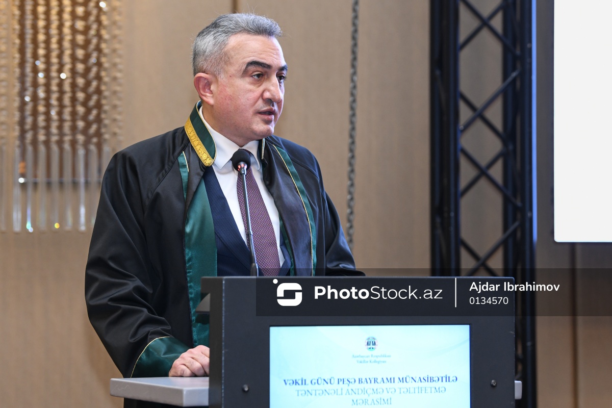 "Vəkil Günü" peşə bayramı münasibətilə keçirilən andiçmə və təltifolunma mərasimində çıxış edən Vəkillər Kollegiyasının (VK) sədri Anar Bağırov.