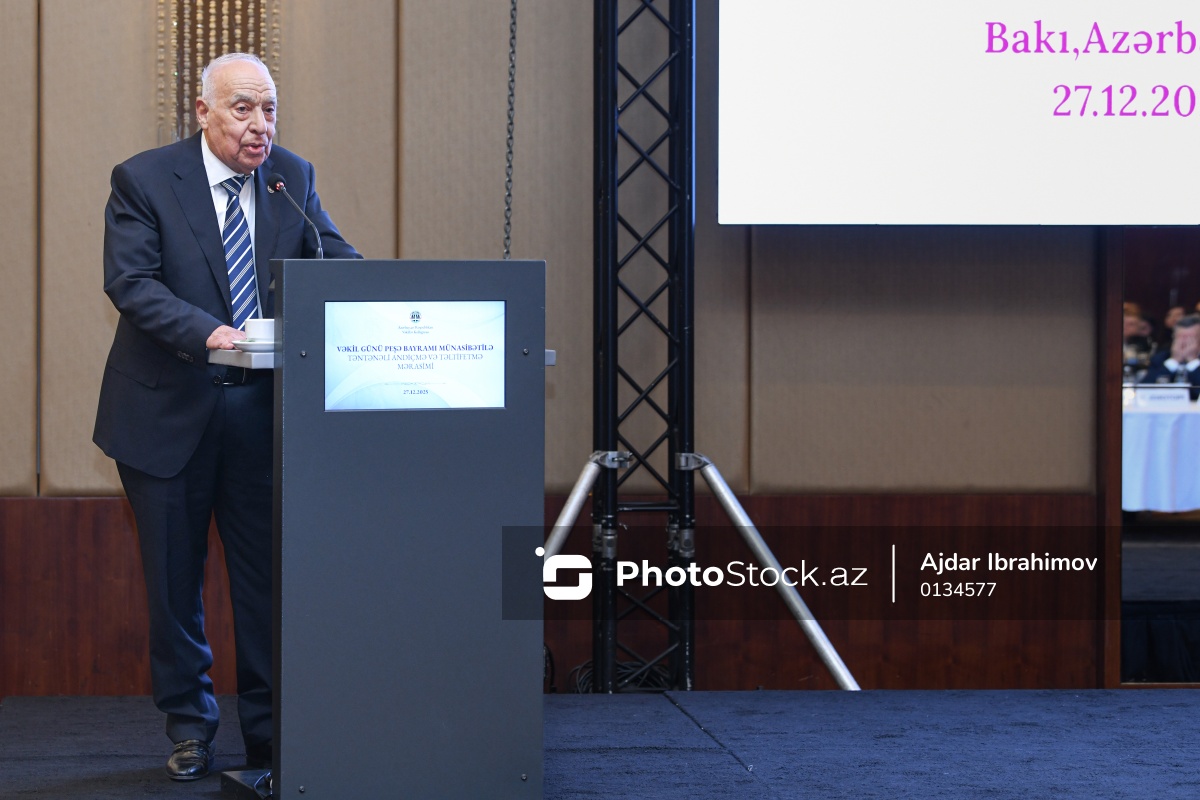 "Vəkil Günü" peşə bayramı münasibətilə keçirilən andiçmə və təltifolunma mərasimində çıxış edən Vəkillər Kollegiyasının (VK) Ağsaqqallar Şurasının sədri İkram Kərimov.