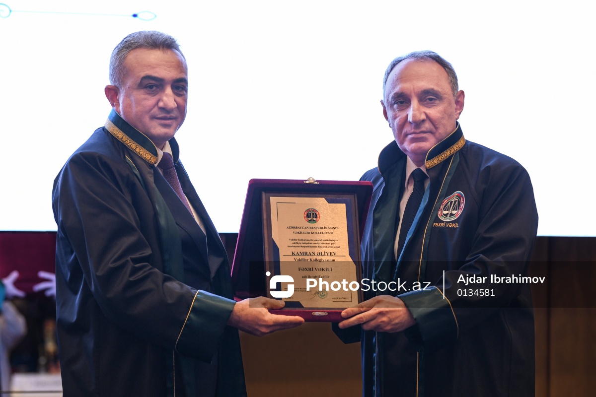 "Vəkil Günü" peşə bayramı münasibətilə keçirilən andiçmə və təltifolunma mərasimi çərçivəsində Vəkillər Kollegiyasının sədri Anar Bağırov (sol) Baş prokuror Kamran Əliyevi (sağ) təltif edib. Belə ki, vəkilliyin inkişafına verdiyi töhfəyə və səmərəli əməkdaşlığa görə Kamran Əliyev "Fəxri vəkil" adı ilə təltif olunub, ona rəmzi vəkil mantiyası təqdim edilib.