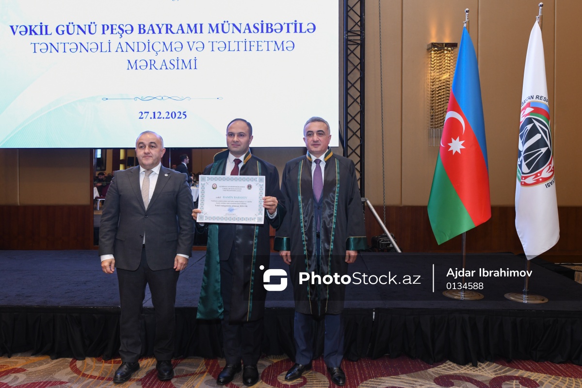 Vəkillər Kollegiyasının (VK) üzvlüyünə yeni qəbul olunan vəkillərin andiçmə və peşə fəaliyyəti dövründə fərqlənənlərin təltifolunma mərasimi keçirilib. Tədbir hər il dekabrın 28-də Azərbaycanda "Vəkil Günü" kimi qeyd edilən peşə bayramına həsr olunub. Mərasimdə Vəkillər Kollegiyasının rəhbərliyi ilə yanaşı, Baş prokuror Kamran Əliyev, Ali Məhkəmənin və Məhkəmə-Hüquq Şurasının sədri İnam Kərimov, Prezident Administrasiyasının Hüquq mühafizə orqanları ilə iş şöbəsinin Hüquqi xidmətlərin göstərilməsi məsələləri sektorunun müdiri Həsən Bağırov, vəkil qurumlarının rəhbərləri, hüquq müdafiəçiləri, eləcə də kütləvi informasiya vasitələrinin nümayəndələri iştirak ediblər. Tədbirdə rəsmi çıxışlarından sonra VK üzvlüyünə yeni qəbul olunan vəkillərin andiçmə mərasimi baş tutub. Sonda yeni vəkillərə vəsiqələri təqdim edilib və təltifolunma mərasimi baş tutub.
