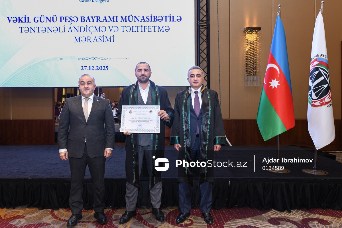 Vəkillər Kollegiyasının (VK) üzvlüyünə yeni qəbul olunan vəkillərin andiçmə və peşə fəaliyyəti dövründə fərqlənənlərin təltifolunma mərasimi keçirilib. Tədbir hər il dekabrın 28-də Azərbaycanda "Vəkil Günü" kimi qeyd edilən peşə bayramına həsr olunub. Mərasimdə Vəkillər Kollegiyasının rəhbərliyi ilə yanaşı, Baş prokuror Kamran Əliyev, Ali Məhkəmənin və Məhkəmə-Hüquq Şurasının sədri İnam Kərimov, Prezident Administrasiyasının Hüquq mühafizə orqanları ilə iş şöbəsinin Hüquqi xidmətlərin göstərilməsi məsələləri sektorunun müdiri Həsən Bağırov, vəkil qurumlarının rəhbərləri, hüquq müdafiəçiləri, eləcə də kütləvi informasiya vasitələrinin nümayəndələri iştirak ediblər. Tədbirdə rəsmi çıxışlarından sonra VK üzvlüyünə yeni qəbul olunan vəkillərin andiçmə mərasimi baş tutub. Sonda yeni vəkillərə vəsiqələri təqdim edilib və təltifolunma mərasimi baş tutub.