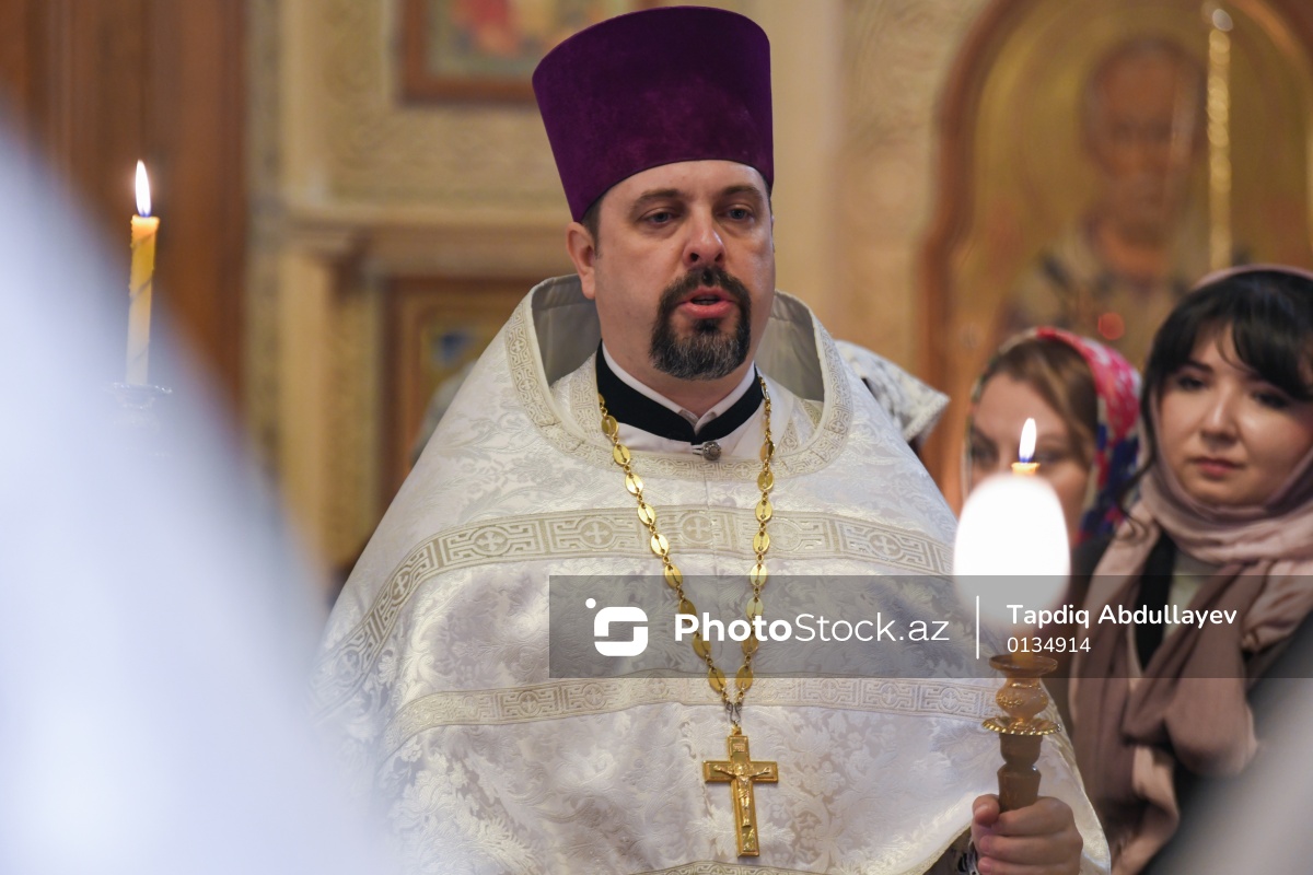 Müqəddəs Mürdaşıyan Zənənlər Kafedral Kilsəsində qeyd olunan Milad bayramında çıxış edən Rus Pravoslav Kilsəsinin Bakı və Azərbaycan Yeparxiya İdarəsinin katibi Dionisiy Sveçnikov.
