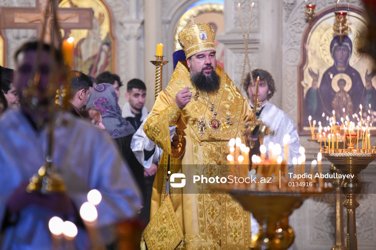 Müqəddəs Mürdaşıyan Zənənlər Kafedral Kilsəsində qeyd olunan Milad bayramında iştirak edən Rus Pravoslav Kilsəsinin Bakı və Azərbaycan Yeparxiyasının rəhbəri Aleksiy Smirnov.