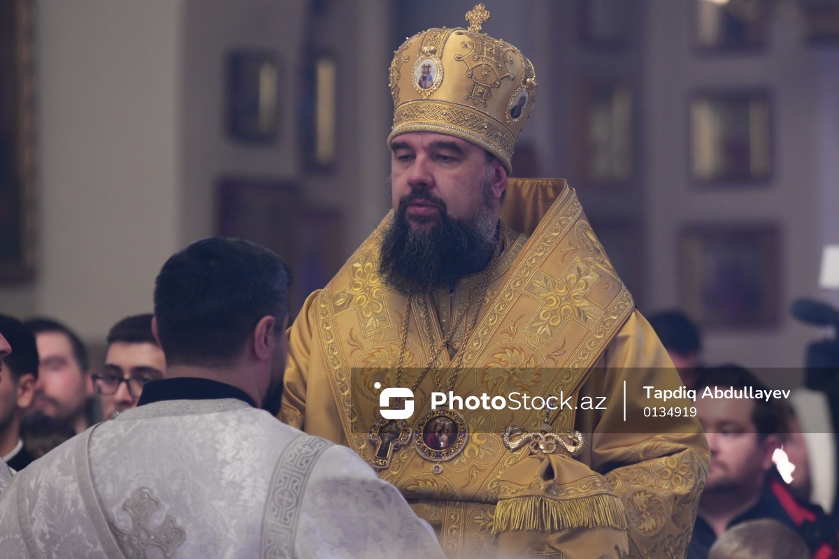 Müqəddəs Mürdaşıyan Zənənlər Kafedral Kilsəsində qeyd olunan Milad bayramında iştirak edən Rus Pravoslav Kilsəsinin Bakı və Azərbaycan Yeparxiyasının rəhbəri Aleksiy Smirnov.