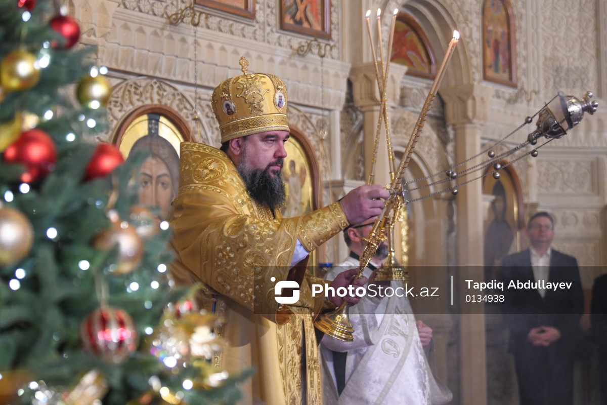 Müqəddəs Mürdaşıyan Zənənlər Kafedral Kilsəsində qeyd olunan Milad bayramında iştirak edən Rus Pravoslav Kilsəsinin Bakı və Azərbaycan Yeparxiyasının rəhbəri Aleksiy Smirnov.