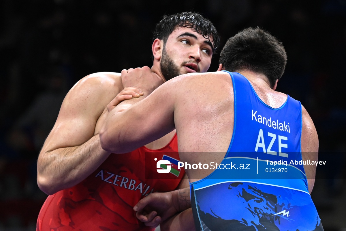 Yunan-Roma güləşi üzrə Azərbaycan çempionatında mübarizə aparan Ayxan Mərdanov (sol) və Beka Kandelaki (sağ).
