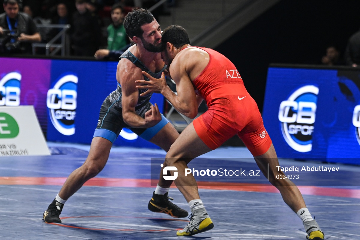 Yunan-Roma güləşi üzrə Azərbaycan çempionatında mübarizə aparan Mikayıl Rəhmanov (sol) və Əsgər Əlizadə (sağ).