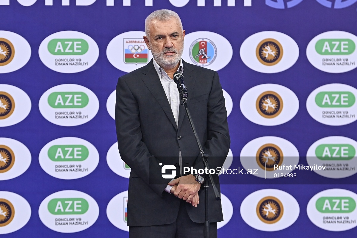 Yunan-Roma və sərbəst güləş üzrə Azərbaycan çempionatının açılış mərasimində çıxış edən Azərbaycan Güləş Federasiyasının vitse-prezidenti Namiq Əliyev.