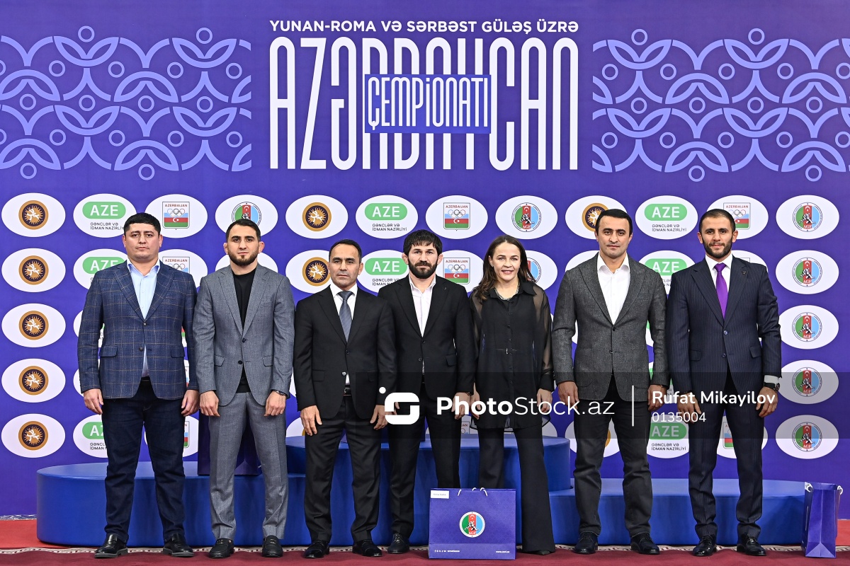 Yunan-Roma və sərbəst güləş üzrə Azərbaycan çempionatının açılış mərasimində iştirak edən (soldan-sağa) güləş üzrə Azərbaycan millisinin sabiq üzvü, dünya çempionu Rəsul Çunayev, Azərbaycan Güləş Federasiyasının sərbəst güləş üzrə koordinatoru, güləş üzrə dünya və Avropa çempionu Hacı Əliyev, Azərbaycan Güləş Federasiyasının İcraiyyə Komitəsinin üzvü Namiq Abdullayev, güləş üzrə Azərbaycan millisinin sabiq üzvü Taleh Məmmədov, Azərbaycan Güləş Federasiyasının qadın güləşi üzrə koordinatoru, 10 qat Avropa və 2 qat dünya çempionu Mariya Stadnik, Azərbaycan Güləş Federasiyasının İcraiyyə Komitəsinin üzvü, Milli Olimpiya Komitəsinin vitse-prezidenti, Olimpiya və 2 qat dünya çempionu Fərid Mansurov, Azərbaycan Güləş Federasiyasının yunan-Roma güləşi üzrə koordinatoru Rafiq Hüseynov.