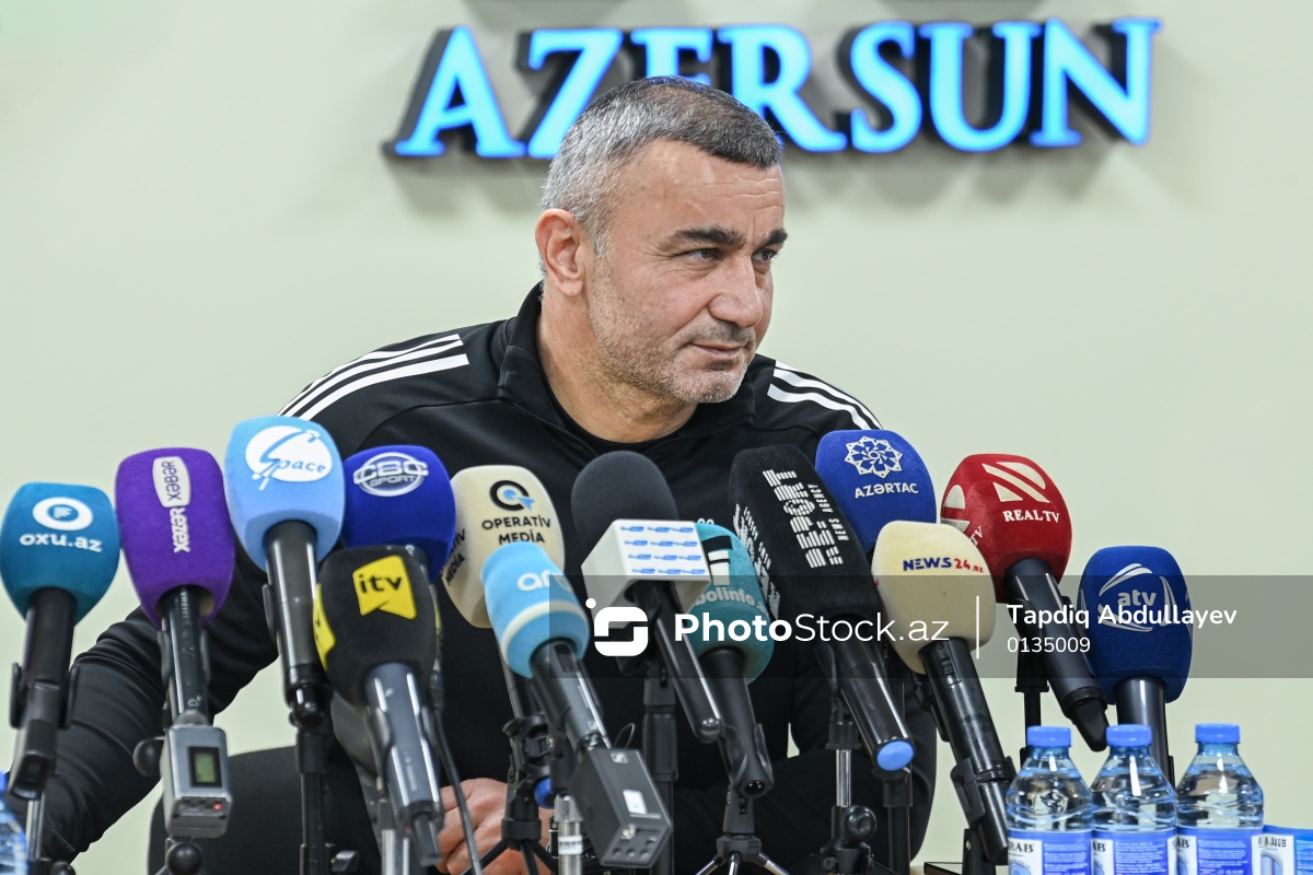 “Azərsun Arena”da keçirilən mətbuat konfransında çıxış edən "Qarabağ" futbol komandasının baş məşqçisi Qurban Qurbanov.