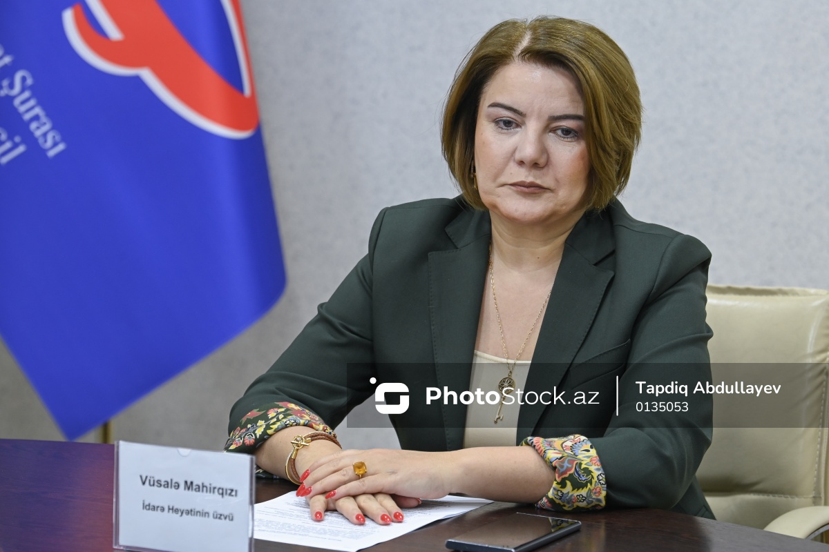 Mətbuat Şurasının Dil Komissiyasının genişləndirilmiş iclasında iştirak edən "APA Media Group”un baş direktoru, Əməkdar jurnalist Vüsalə Mahirqızı.