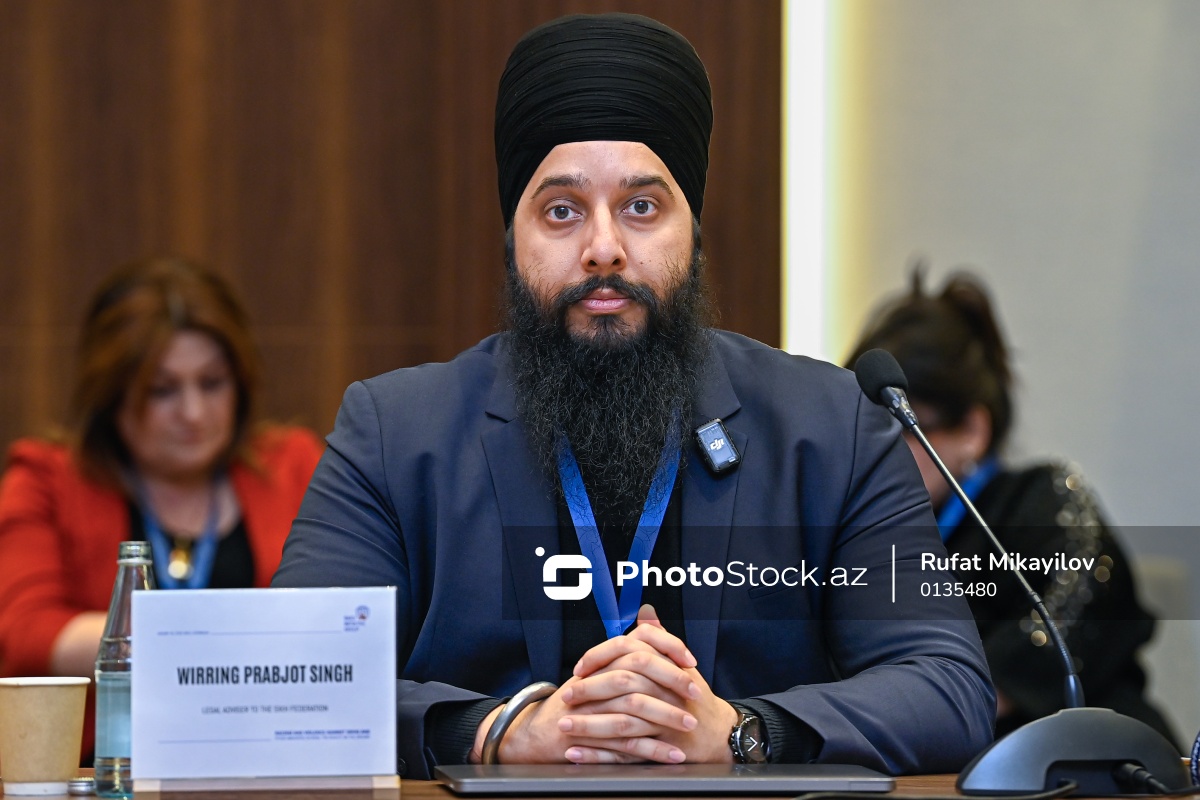 "Hindistanda Siqhlərə və digər milli azlıqlara qarşı irqçilik və zorakılıq: mövcud reallıqlar" adlı beynəlxalq konfransda çıxış edən Siqh Federasiyasının hüquqi məsələlər üzrə məsləhətçisi Wirring Prabjot Singh.