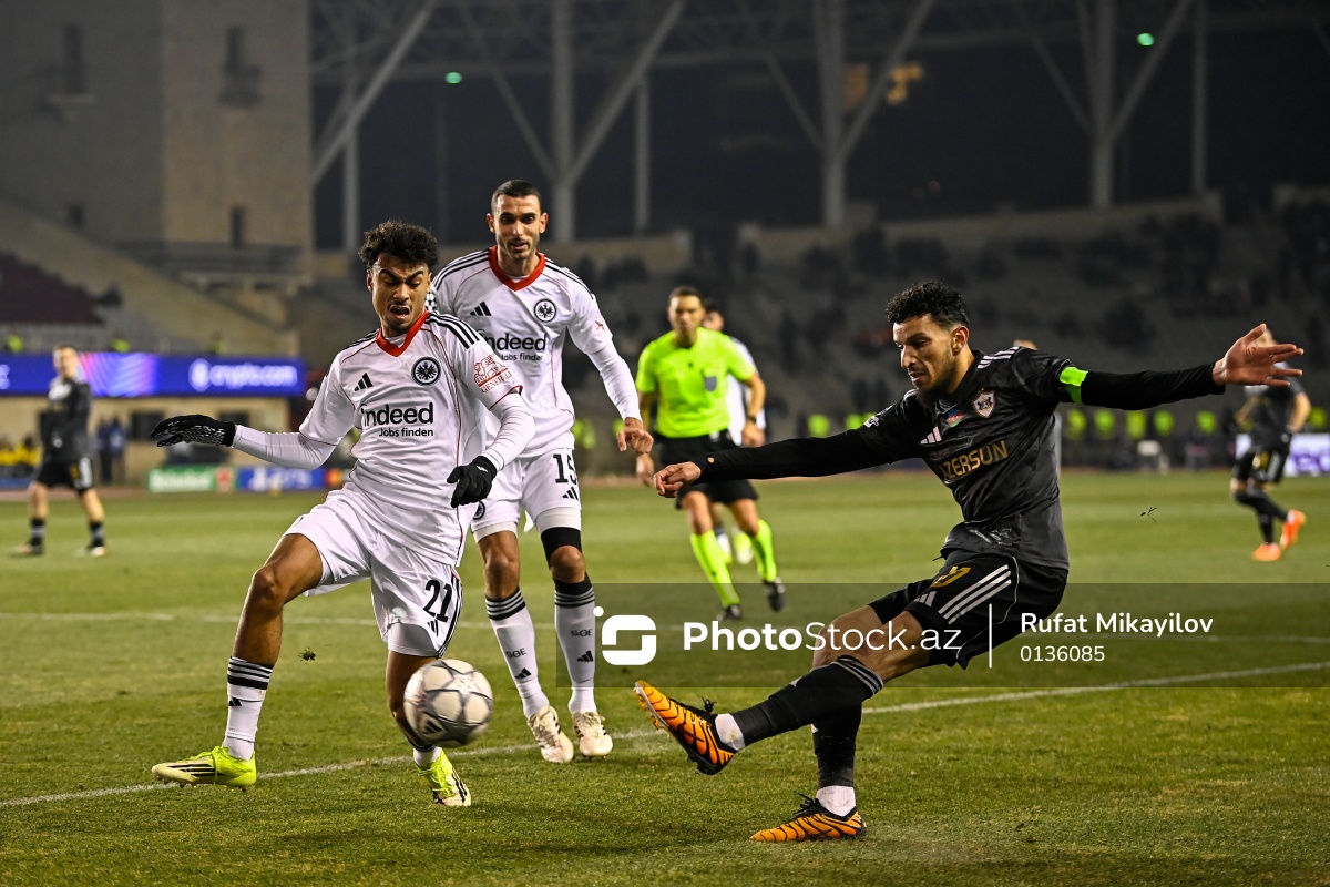 21.01.2026 Tofiq Bəhramov adına Respublika stadionu, UEFA Çempionlar Liqasının "Qarabağ" - "Ayntraxt" oyununda "Ayntraxt" komandasının oyunçuları Nataniel Broun (solda) və Elyes Şkiri (ortada) ilə "Qarabağ" komandasının oyunçusu Abdullah Zubir (sağda) mübarizəsi.