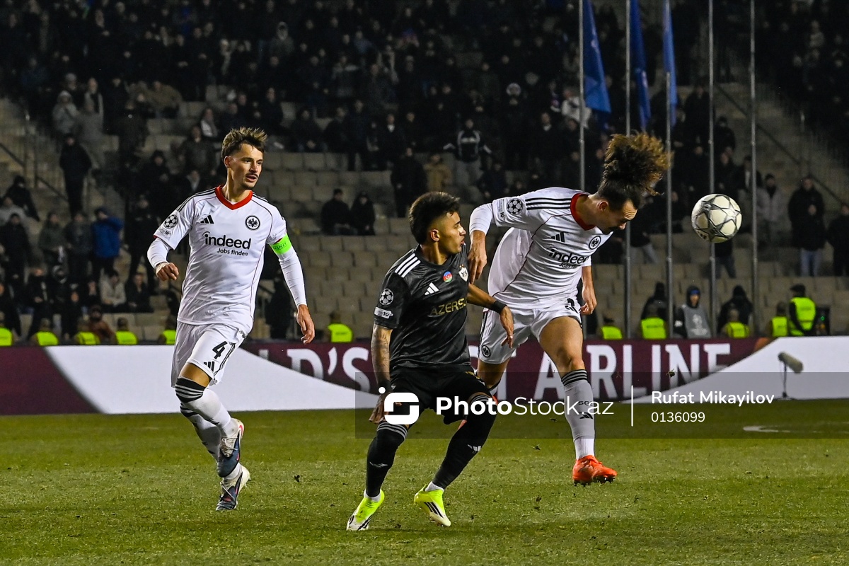 21.01.2026 Tofiq Bəhramov adına Respublika stadionu, UEFA Çempionlar Liqasının "Qarabağ" - "Ayntraxt" oyununda "Ayntraxt" komandasının oyunçuları Robin Koç (solda) və Artur Teate (sağda) ilə "Qarabağ" komandasının oyunçusu Kamilo Duran (ortada) mübarizəsi.