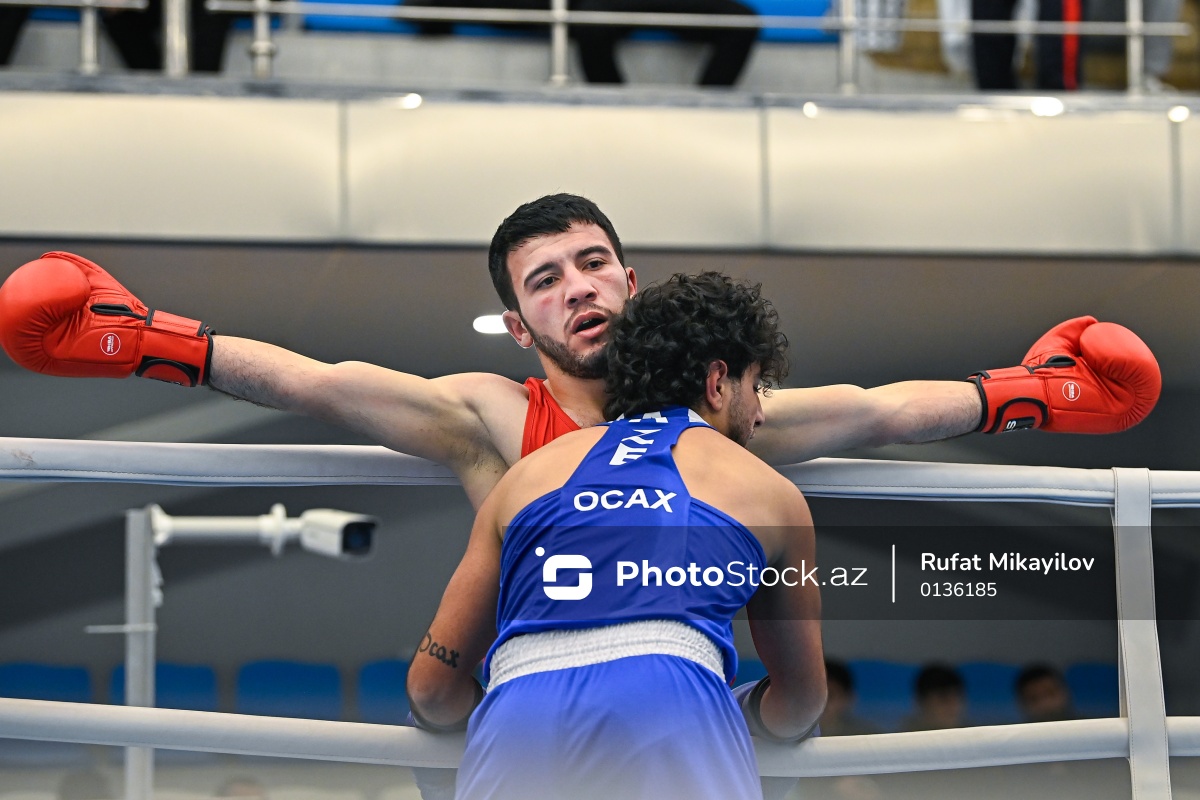 Boks üzrə Azərbaycan çempionatında mübarizə aparan Murad Ocaqquliyev və Nicat Mirzəyev.