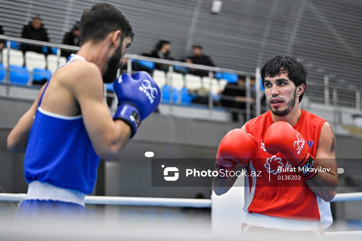 Boks üzrə Azərbaycan çempionatında mübarizə aparan Cəlal Əhmədov (sol) və Ümid Rüstəmov (sağ).