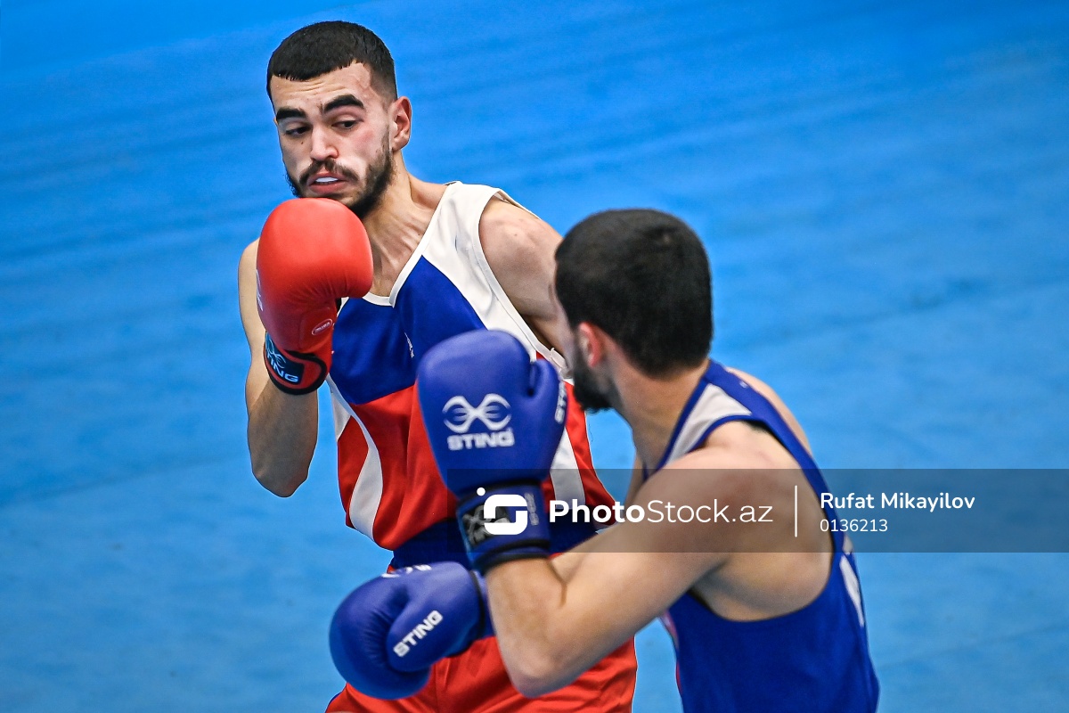 Boks üzrə Azərbaycan çempionatında mübarizə aparan Xalid Abdullayev (sol) və Məhəmmədəli Qasımzadə (sağ).