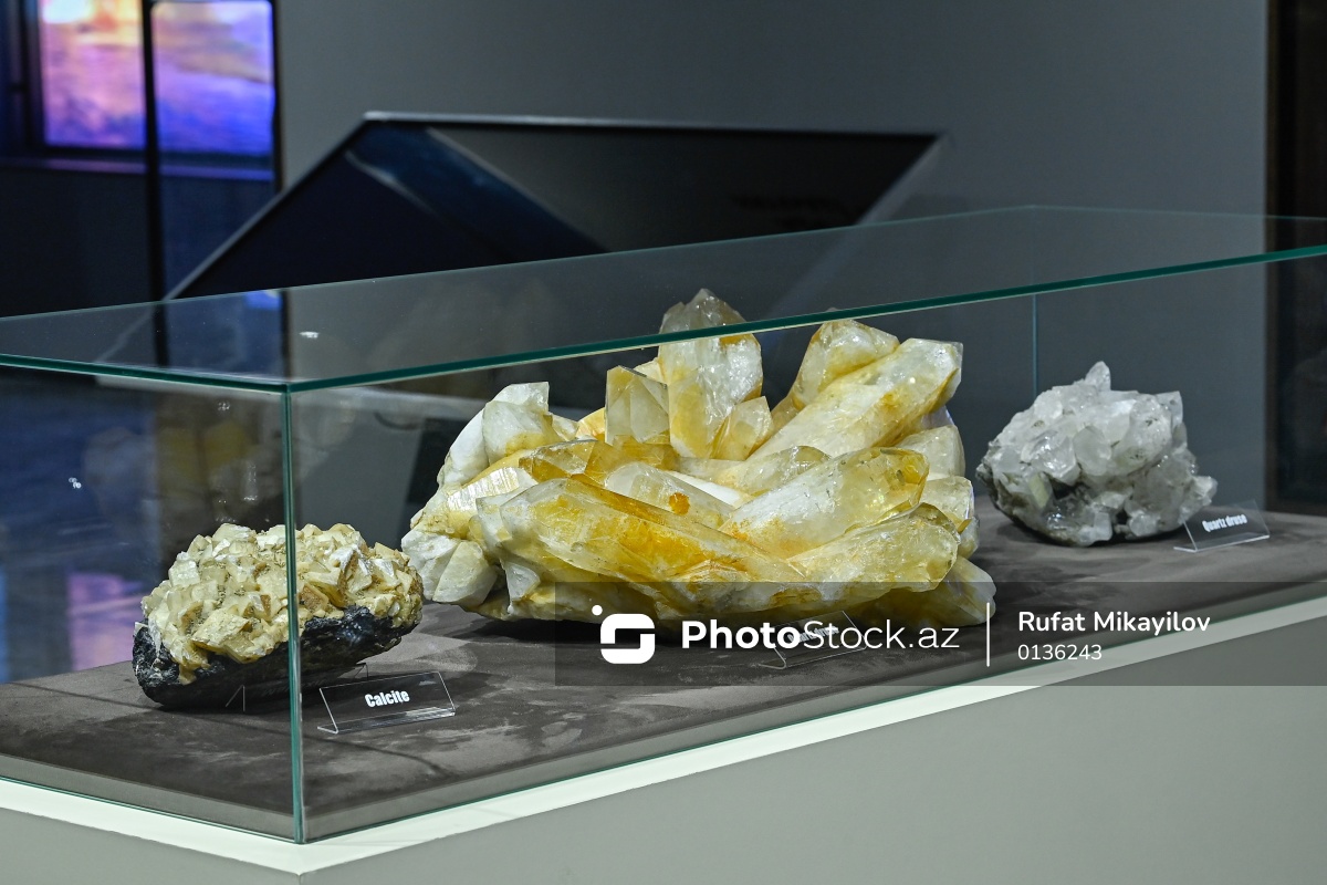 Bakı Dövlət Universitetinin Faydalı qazıntılar muzeyində nümayiş olunan (soldan-sağa) "Calcite" və "Quartz druse" daşları.