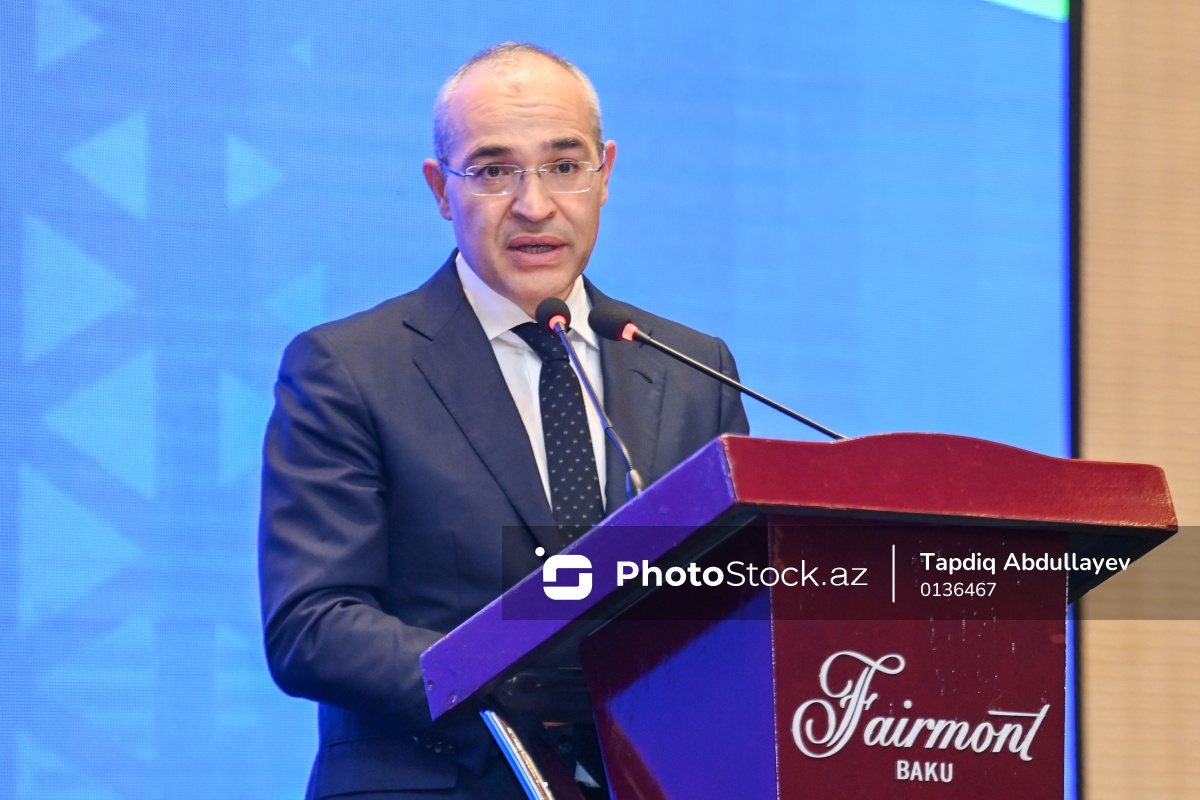 Azərbaycan-İsrail biznes forumunda çıxış edən Azərbaycan Respublikasının iqtisadiyyat naziri Mikayıl Cabbarov.
