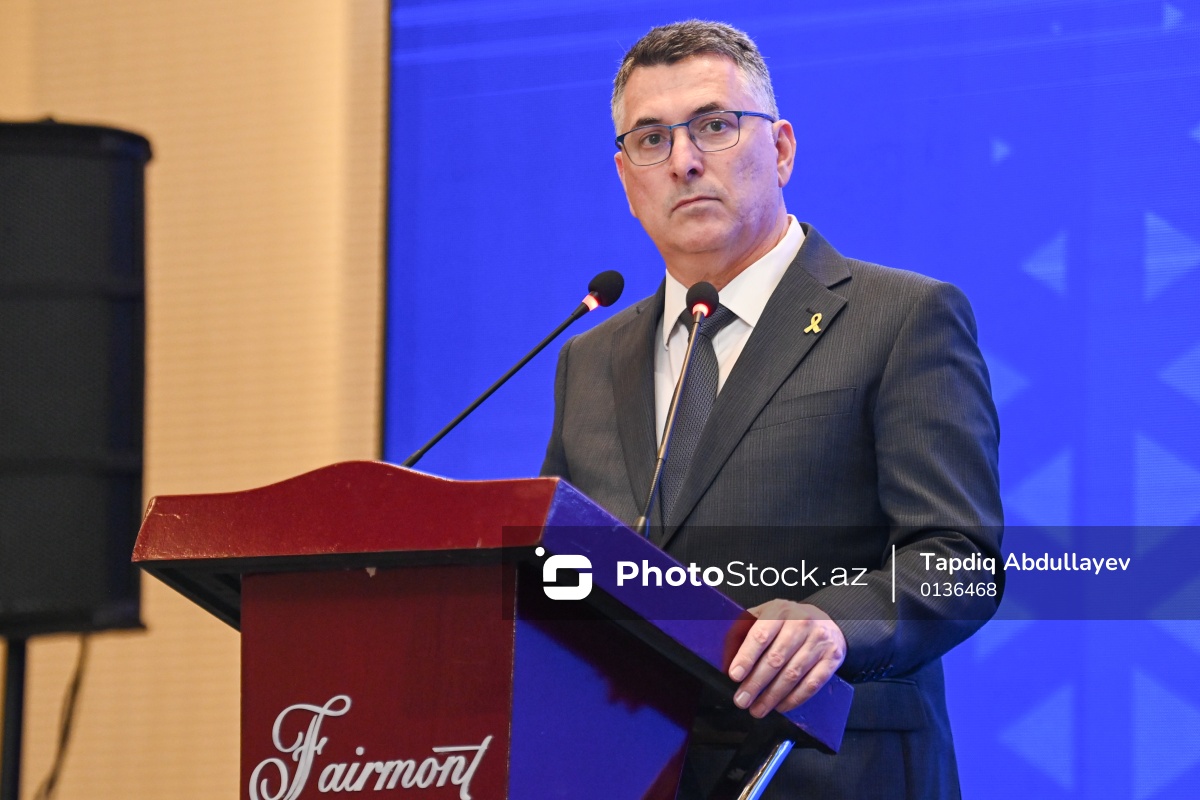 Azərbaycan-İsrail biznes forumunda çıxış edən İsrailin xarici işlər naziri Gideon Saar.