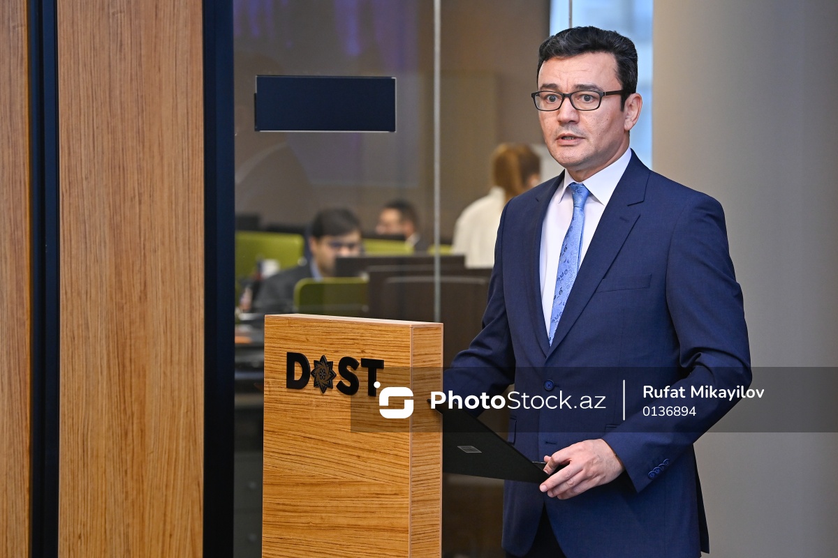 2025-ci ilin yekunlarına həsr olunan mətbuat konfransında çıxış edən DOST Agentliyinin İctimaiyyətlə əlaqələr və kommunikasiya departamentinin direktoru Şahin Əliyev.