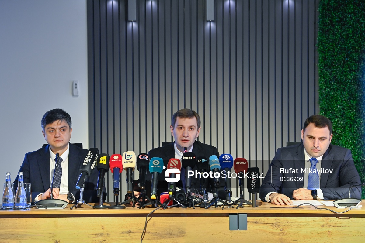 2025-ci ilin yekunlarına həsr olunan mətbuat konfransında iştirak edən (soldan-sağa) İnnovasiya və Rəqəmsal İnkişaf Agentliyinin İdarə Heyəti sədrinin müavini Şahin Əliyev, İdarə heyətinin sədri Fərid Osmanov və İdarə Heyəti sədrinin müavini Rəşad Xalıqov.
