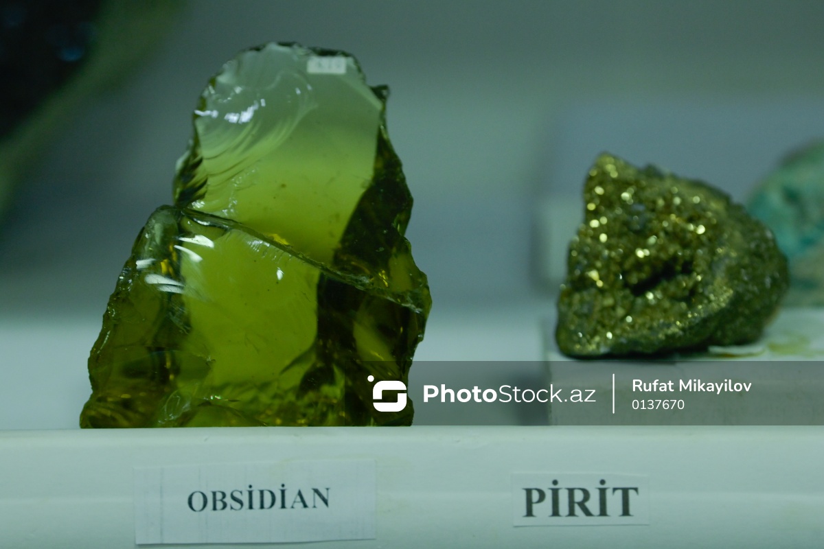 Azərbaycan Dövlət Neft və Sənaye Universitetinin (ADNSU) Mineralogiya Muzeyində nümayiş olunan obsidian (sol) və pirit (sağ).