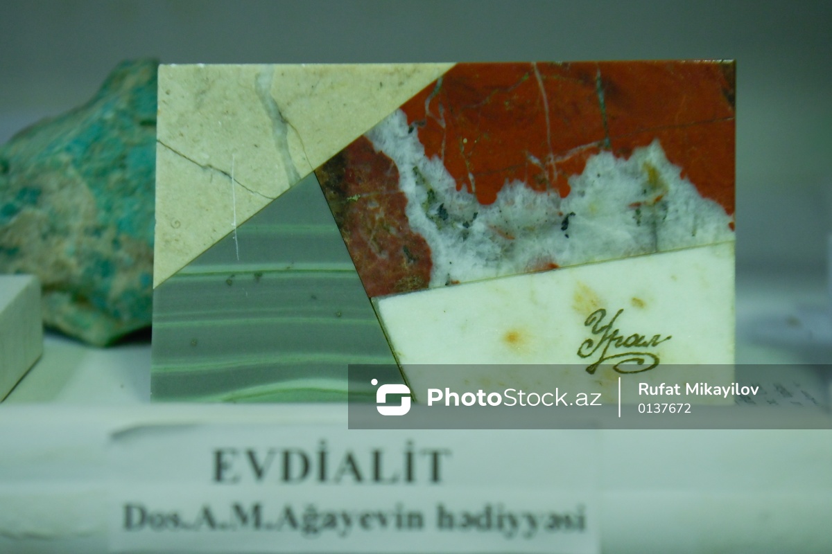 Azərbaycan Dövlət Neft və Sənaye Universitetinin (ADNSU) Mineralogiya Muzeyində nümayiş olunan evdialit.