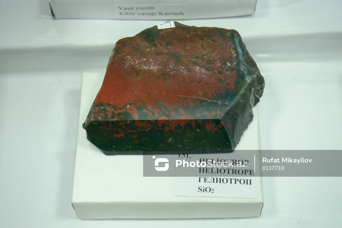 Azərbaycan Dövlət Neft və Sənaye Universitetinin (ADNSU) Mineralogiya Muzeyində nümayiş olunan heliotrop.