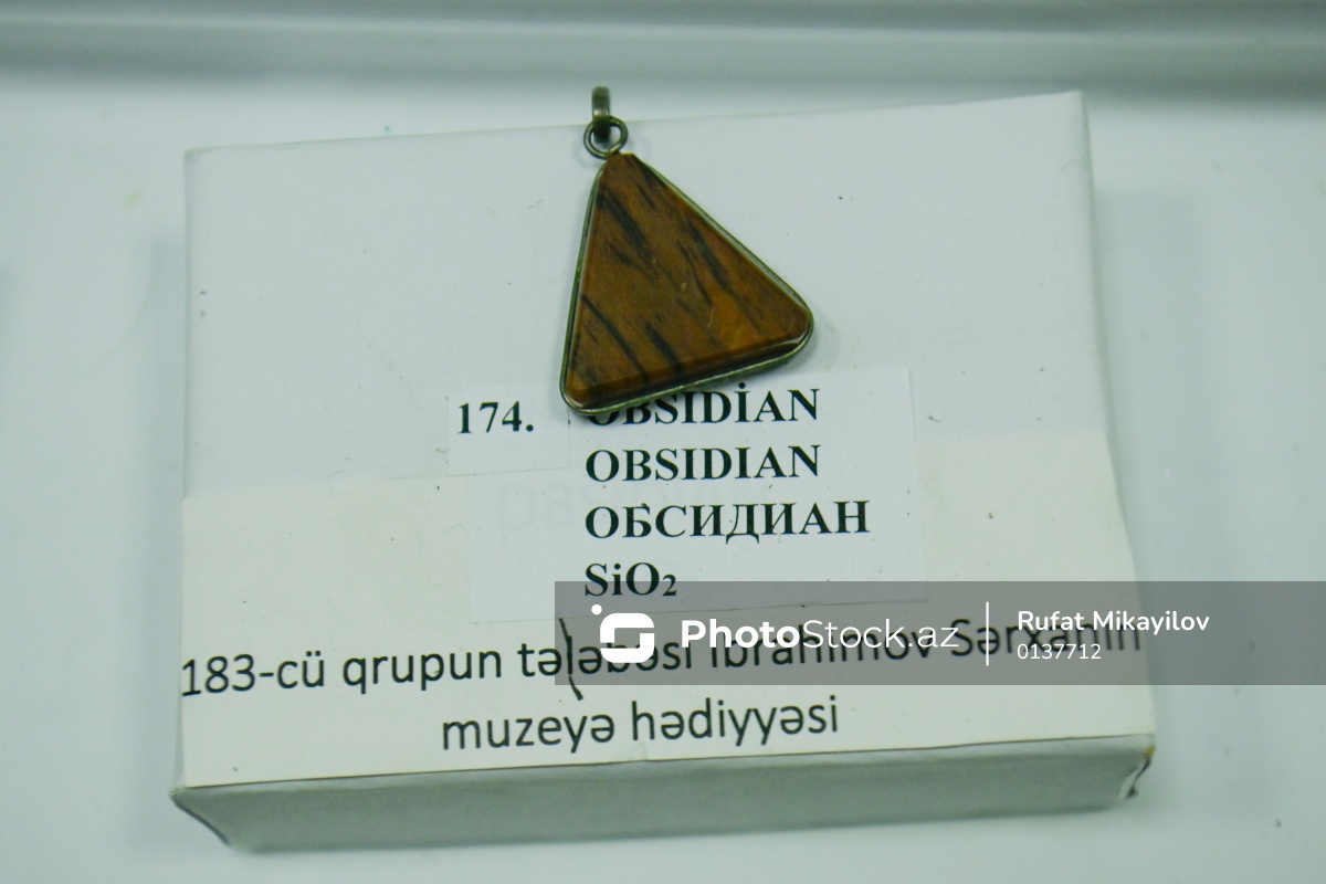 Azərbaycan Dövlət Neft və Sənaye Universitetinin (ADNSU) Mineralogiya Muzeyində nümayiş olunan obsidian.