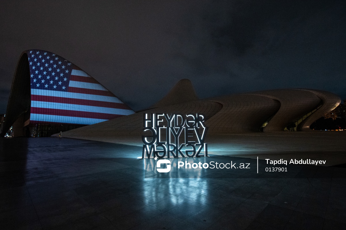 Vitse-prezident Ceyms Devid Vensin rəsmi səfərinin şərəfinə ABŞ bayrağının təsviri ilə işıqlandırılan Heydər Əliyev Mərkəzi