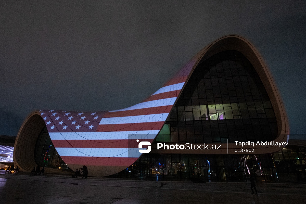 Vitse-prezident Ceyms Devid Vensin rəsmi səfərinin şərəfinə ABŞ bayrağının təsviri ilə işıqlandırılan Heydər Əliyev Mərkəzi