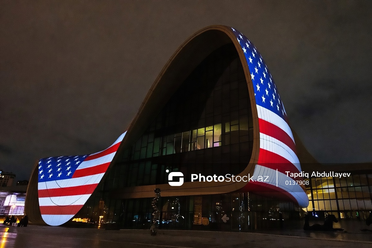 Vitse-prezident Ceyms Devid Vensin rəsmi səfərinin şərəfinə ABŞ bayrağının təsviri ilə işıqlandırılan Heydər Əliyev Mərkəzi