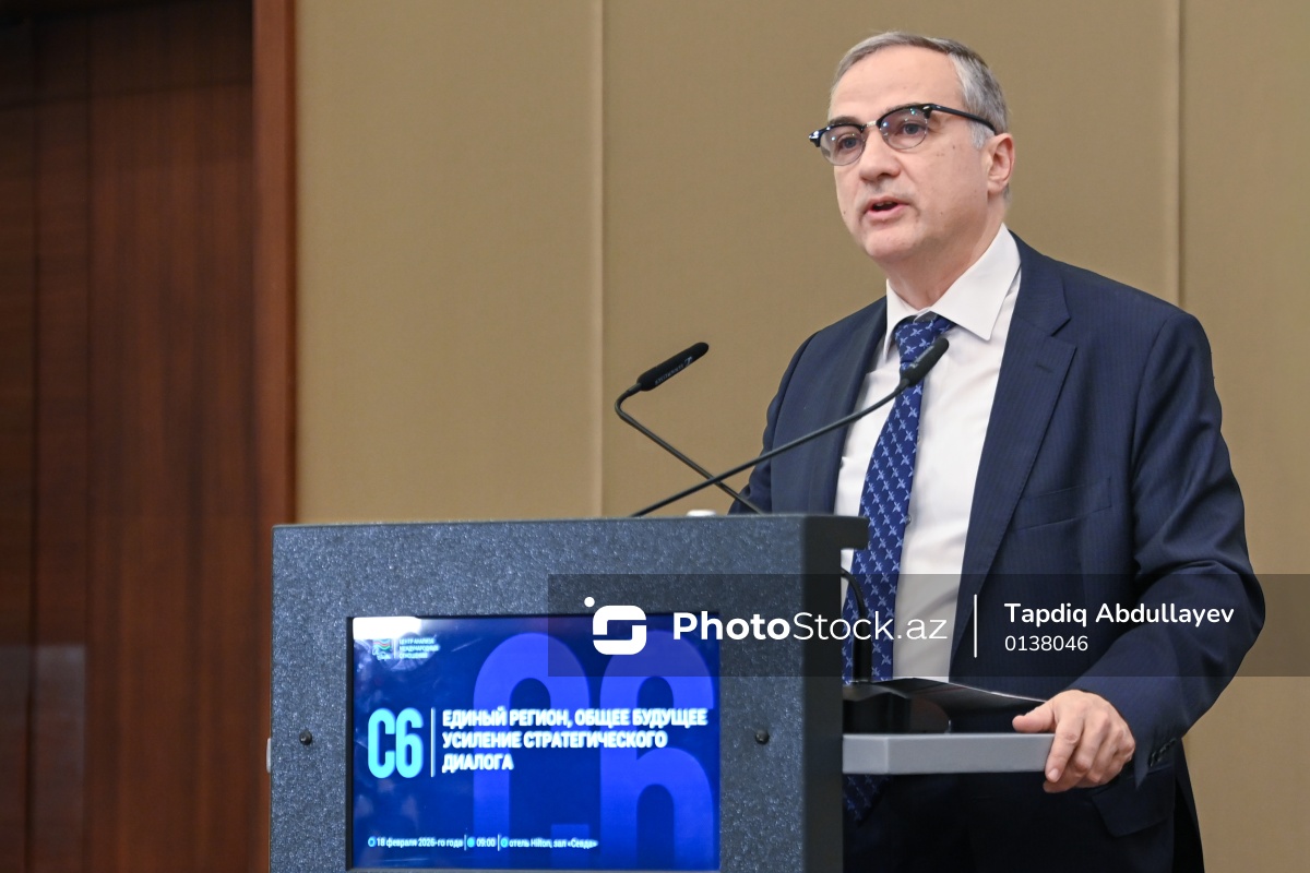 “C6: Vahid region, ortaq gələcək - Strateji dialoqun gücləndirilməsi” mövzusunda beynəlxalq konfransda çıxış edən Beynəlxalq Münasibətlərin Təhlili Mərkəzi (BMTM) İdarə Heyətinin sədri Fərid Şəfiyev.