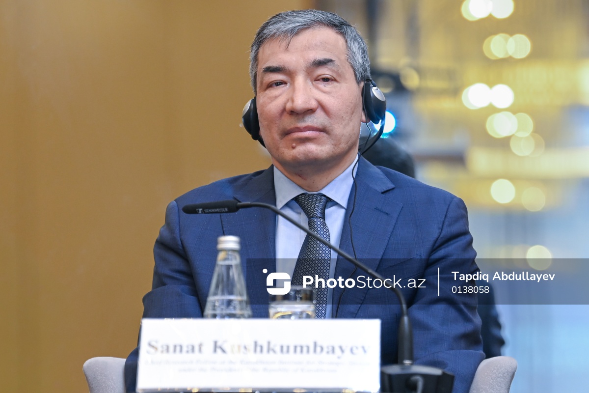 “C6: Vahid region, ortaq gələcək - Strateji dialoqun gücləndirilməsi” mövzusunda beynəlxalq konfransda çıxış edən Qazaxıstan Strateji Tədqiqatlar İnstitutunun baş elmi işçisi Sanat Kuşkumbayev.
