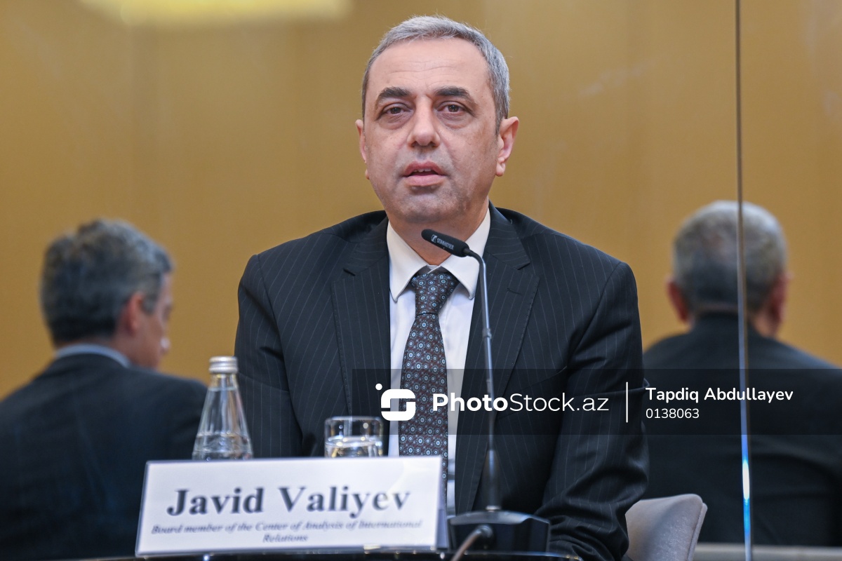 “C6: Vahid region, ortaq gələcək - Strateji dialoqun gücləndirilməsi” mövzusunda beynəlxalq konfransda çıxış edən Beynəlxalq Münasibətlərin Təhlili Mərkəzinin İdarə Heyətinin üzvü Cavid Vəliyev.